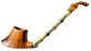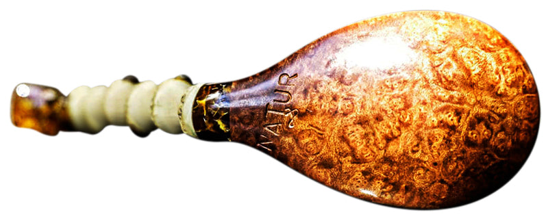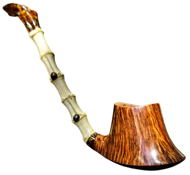 Abi and I talked about his making, a few of his version, traditional pipe shapes. This is the first in bamboo I have received from him. A large bowl Volcano with a with an large foot, bamboo shank, and 4 knuckle holes adorned with sea stone. The sides of the bowl all have tight up and down flame grain, and bottom covered in fine birdseye. The lovely patterned Lucite stem and matching shank band. A superb large traditional volcano.