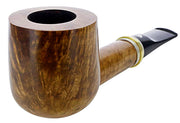 Albertos' signature solid Pot/Billiard is always good sized & thick walled.   With this piece he has lengthen the shank a bit, created a saddle stem and the ornamentation is titanium band with a outer band that is not bronze nor gold. Best I can tell. This gives the pipe a certain flare.